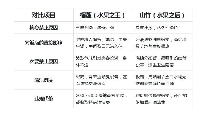 若游客将山竹带入客房食用,即便没有弄脏织物,仅将果皮丢进房间垃圾桶,短时间内就会吸引成群蚂蚁,不仅严重影响住宿体验,还会增加饭店除虫、环境维护的成本。为从根源杜绝虫害风险,禁止山竹入内成了最直接的管理方式。