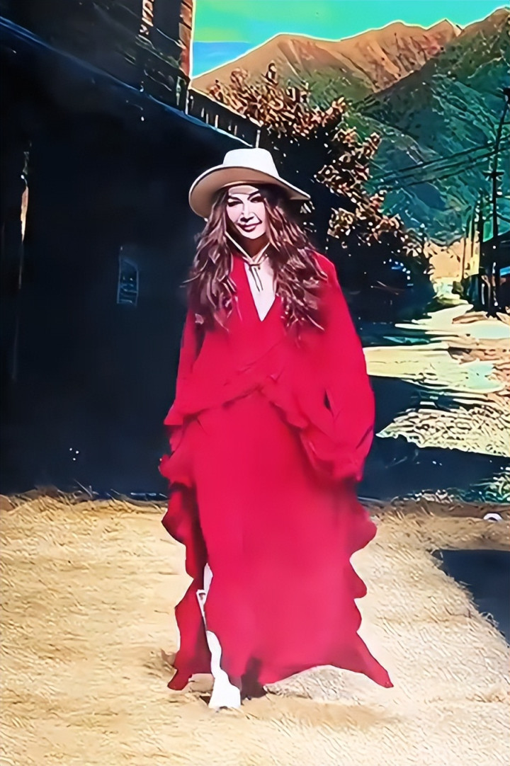 造型确实挺有记忆点,深V的造型,还是“大红袍”,一上场瞬间就被吸引住了视线。