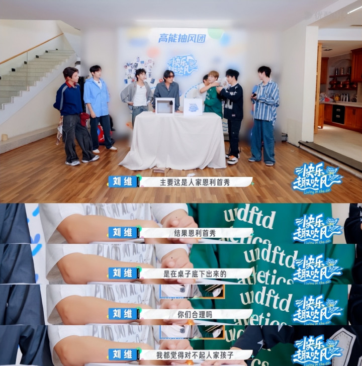 那副怂怂的模样真的是让人忍俊不禁,偏偏旁边的刘维还在拱火,说人家孩子综艺首秀就让人钻桌子。