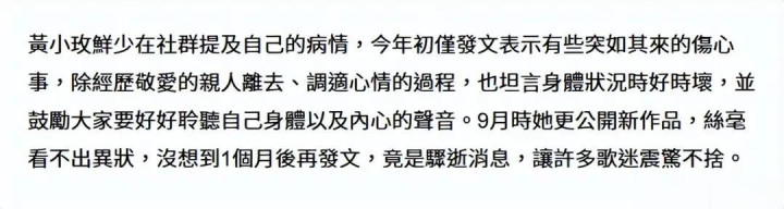 突发!34岁台湾歌手黄小玫因罕见病猝逝