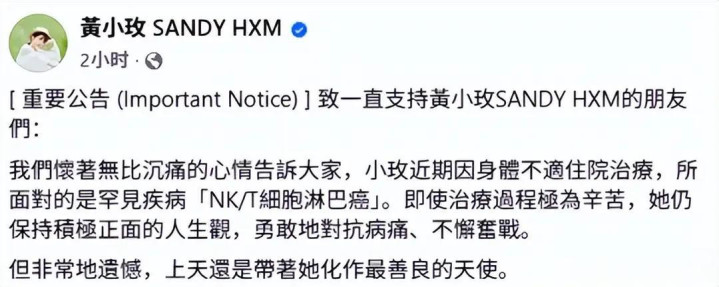 据悉,“NK/T细胞淋巴癌”恶性程度高、治疗难度大,晚期患者甚至无法进食,极为折磨人。黄小玫生前从未详述病情,想来是想将最美好的一面留给歌迷。