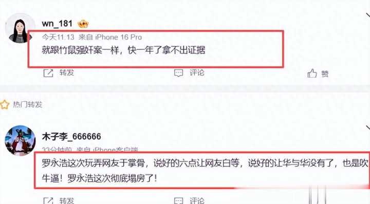 有网友说罗永浩就跟竹鼠强奸案一样,快一年了都拿不出证据。把网友玩弄于鼓掌,说好的6点让网友白等,说好的让华与华没有了,也是吹牛逼,罗永浩这次彻底塌房了……